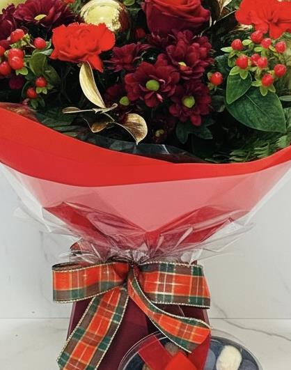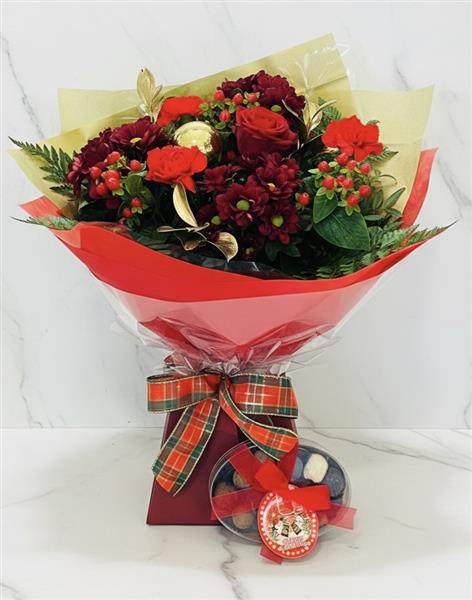 our popular christmas carol handtied in water delivered with a box of Hames handmade chocolates