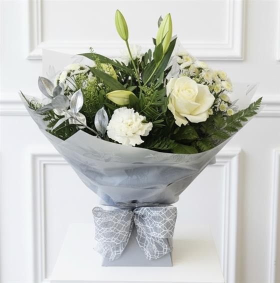 a beautiful scented white with a hint of silver handtied in water, featuring lily, carnation, chrysanths and rose with mixed foliage, handmade and delivered in water in a box finished with a christmas bow