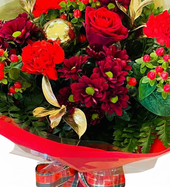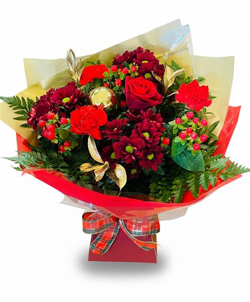 our traditional all red christmas handtied in water, with long lasting chrysanths carnations and berries with red roses and gold ruscus, handmade and delivered in a box finished with a christmas bow
