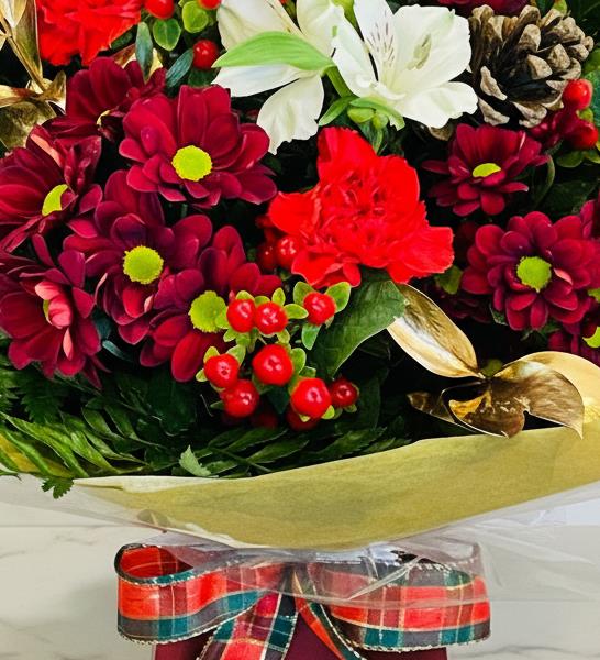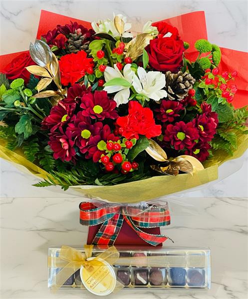 Our traditional christmas handtied and a box of handmade Hames chocolates is the perfect gift for flowers and chocolate lovers