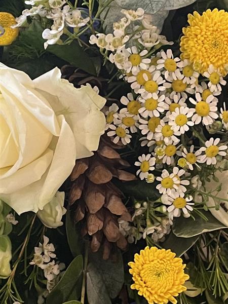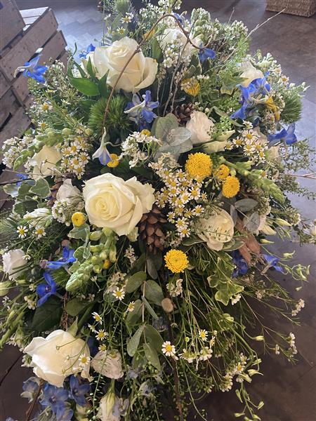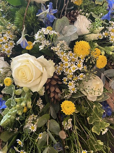 our popular woodland inspired casket sprays featuring cones bark and willow/twigs filled with beautiful roses, delphinium, dianthus, tanacteum waxflower, and thistle finished with mixed foliage to create a loose and unstructured design